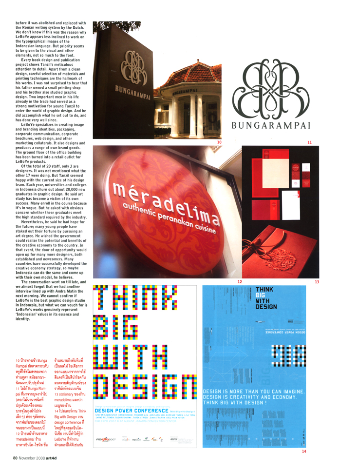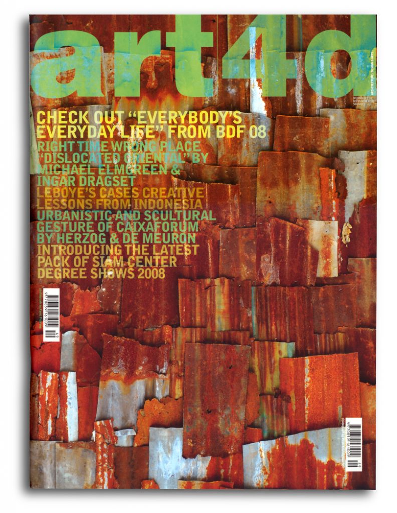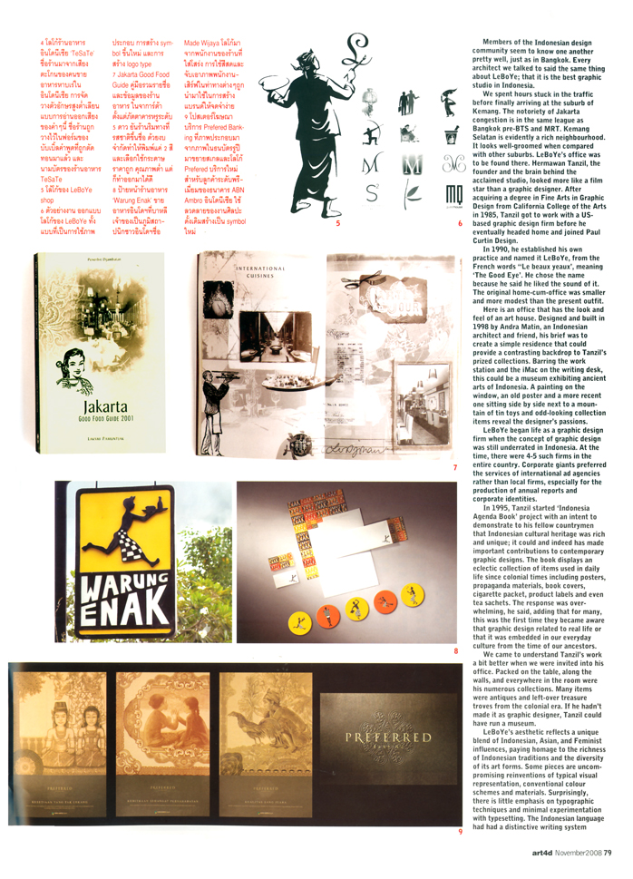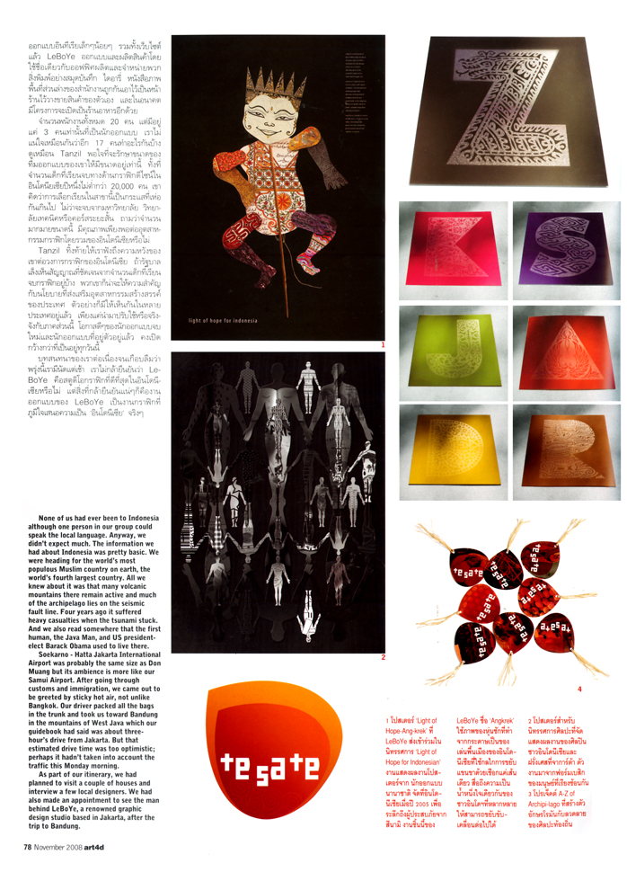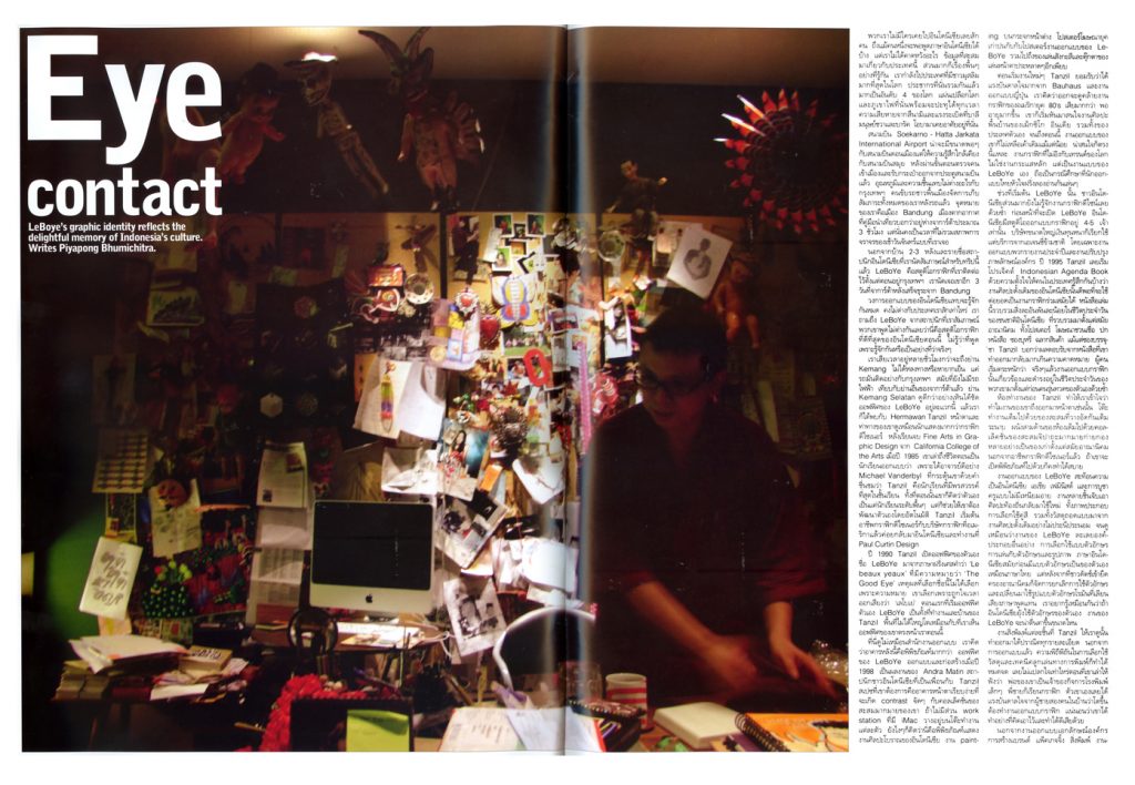 An art and architecture magazine from Thailand, art4d, has featured LeBoYe for the Eye Contact section in their latest issue. The article started with the writer’s experiences during his short trip to Indonesia a few months ago. We were just amongst the few designers that Piyapong Bhumichitra met and interviewed to get a taste of current Indonesian art and design.